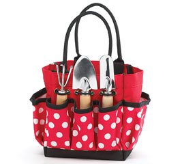 - Design: Tote featuring a red tote with polka dots and black trim, includes pockets to hold tools. Complete with 2 shovels and 1 cultivator.