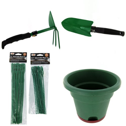 Set yourself up right with this great 5-piece gardening kit. Each piece will aid you on your way to gardening greatness. Included in set are an 8in self-watering planter, a metal garden spade, a metal garden hoe/rake, and 12in and 8in adjustable plant ties. The metal garden spade and the hoe/rake are made from tough metal and include an oversized grip for a firm, comfortable hold. They will help prepare the soil and plant your seeds. Once your plants have grown, use the adjustable plant ties to attach them to a stake for controlled growth. This is a great gardening starter kit- just add dirt and seeds!