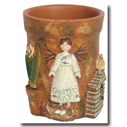 All good things that come from the earth are watched over by a gardening angel, and this garden themed tumbler is no different! There?s a little countrified celestial figure with twig wings, a bird?s nest, flowers and a birdhouse that turn a humble drink of water from the tap, into a toast to Nature. Resin. 3.25 x 4.25 inches.
